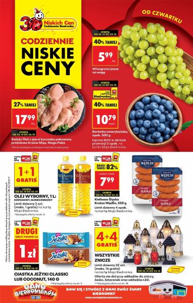 Sklepy Biedronka oferują swoim klientom dwa rodzaje gazetek promocyjnych. Pierwsza z nich ukazuje promocje artykułów spożywczych i przemysłowych obowiązujące w danym tygodniu. Natomiast druga gazetka Biedronki to „Okazje tygodnia”, na łamach której prezentowane są takie produkty jak: akcesoria domowe, odzież i dodatki, tekstylia, zabawki, sprzęty domowe, artykuły dekoracyjne, biurowe oraz drobne AGD i RTV. Dodatkowo słynna siedmiokropka dba również o rozwój kulturalny swoich klientów podsuwając im ciekawą ofertę książek czy winyli. W gazetkach promocyjnych Biedronki z ofertą książkową znajdziemy między innymi: różnorakie poradniki, książeczki dla dzieci, słowniki, książki edukacyjne, powieści czy ostatnie bestsellery. Warto także wspomnieć, że w Biedronce znajdziemy mnóstwo produktów marek własnych sklepu, które produkowane są przez uznanych na całym świecie producentów żywności oraz chemii gospodarczej. Gazetka promocyjna Biedronka przepełniona jest tego rodzaju produktami, które w parze ze świetną jakością niosą znakomicie niską cenę. Warto zapoznać się z listą takich produktów, by być świadomym klientem oraz nie przepłacać za swoje zakupy.