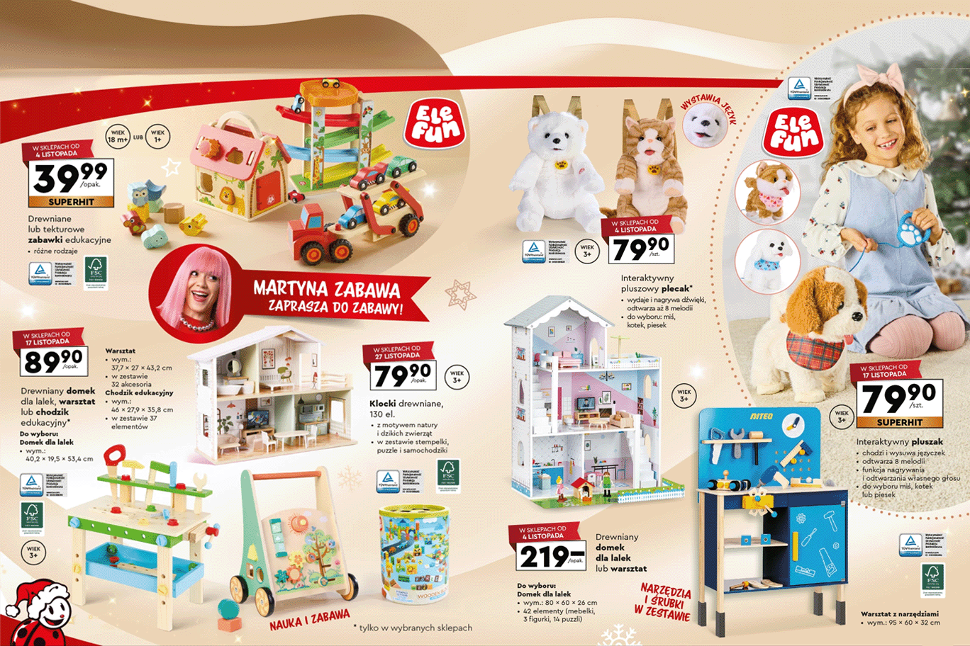 To jednak nie wszystko – w Biedronce do kupienia są też takie zabawki, jak drewniany domek dla lalek lub warsztat (219 zł, od 04.11), drewniany zestaw do wizażu (89,90, od 17.11), tor wyścigowy z elektrycznym samochodem (99 zł, od 04.11), figurki zwierząt i dinozaurów (39,99 zł, od 27.11) czy pluszaki w niemal wszystkich rozmiarach (29,99 – 59,99 zł, od 04.11).