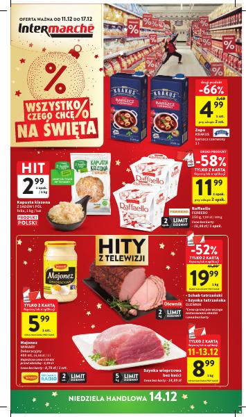 Gazetka promocyjna Intermarche przedstawia przede wszystkim świeżą żywność – warzywa, owoce, zioła, pieczywo oraz mięso i wędliny (sklepy posiadają własne wędzarnie i piekarnie). Wynika to z głównego założenia sieci, które zakłada ofertę produktów zawsze tanich i świeżych – głosi to również hasło sklepu. W gazetkach prezentowane są zarówno produkty znanych firm jak i marek własnych Intermarche. Sklep stawia również na BIOżywność i zdrowy tryb życia. Z tego podowu w swoim asortymencie oferuje certyfikowane BIOprodukty. Można je znaleźć na specjalnie oznaczonych półkach oraz w korzystnych cenach w gazetkach promocyjnych supermarketu. Gazetki promocyjne Intermarche często proponują także drobne artykuły gospodarstwa domowego, markowe kosmetyki oraz wiele produktów na wagę. Klientom z ograniczoną liczbą czasu polecamy usługę Drive Intermarche. Pozwala ona na złożenie zamówienia online i odebranie zakupów w wybranym, dowolnym terminie.