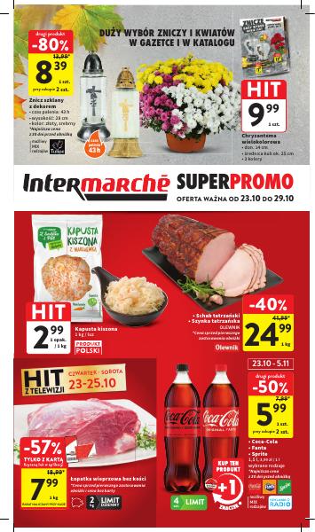 Gazetka promocyjna Intermarche przedstawia przede wszystkim świeżą żywność – warzywa, owoce, zioła, pieczywo oraz mięso i wędliny (sklepy posiadają własne wędzarnie i piekarnie). Wynika to z głównego założenia sieci, które zakłada ofertę produktów zawsze tanich i świeżych – głosi to również hasło sklepu. W gazetkach prezentowane są zarówno produkty znanych firm jak i marek własnych Intermarche. Sklep stawia również na BIOżywność i zdrowy tryb życia. Z tego podowu w swoim asortymencie oferuje certyfikowane BIOprodukty. Można je znaleźć na specjalnie oznaczonych półkach oraz w korzystnych cenach w gazetkach promocyjnych supermarketu. Gazetki promocyjne Intermarche często proponują także drobne artykuły gospodarstwa domowego, markowe kosmetyki oraz wiele produktów na wagę. Klientom z ograniczoną liczbą czasu polecamy usługę Drive Intermarche. Pozwala ona na złożenie zamówienia online i odebranie zakupów w wybranym, dowolnym terminie.