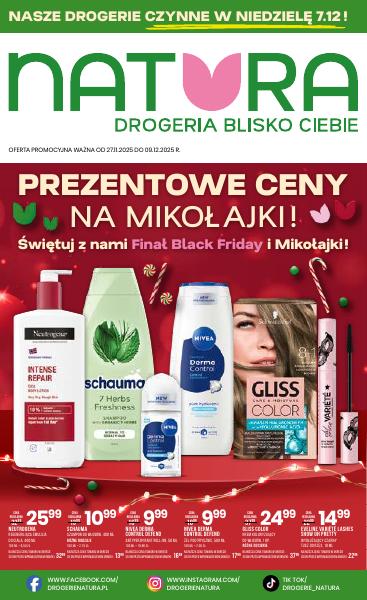 Gazetka promocyjna drogerii Natura zawiera szeroką ofertę artykułów kosmetycznych, przemysłowych, pielęgnacyjnych oraz perfum. Gazetki i oferty promocyjne proponują najlepsze kosmetyki w bardzo dobrych, rabatowych cenach. Pojawiają się w nich również produkty przeznaczone do koloryzacji i pielęgnacji włosów oraz drobna biżuteria. Gazetka promocyjna drogerii Natura wydawana jest raz w miesiącu. Ostatnio w gazetkach promocyjnych sieci pojawiają się także fantastyczne kilkudniowe promocje na wybrane artykuły danej marki – wyprzedaże sięgają nawet do – 40 % na wybrany asortyment.